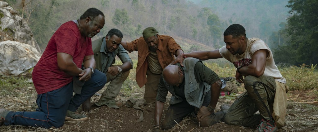 In Da 5 Bloods, a group of Black Vietnam War veterans (dubbed “Bloods”) travel back to Vietnam to retrieve a stash of gold they had buried away and to recover the remains of their squad leader, Norman (Chadwick Boseman). The film cross-cuts between the group’s present day journey and their time at war — buttressed visually by a shifting aspect ratio and the fact that the same actors portray themselves both in present day and in the past — thus cementing the notion that the trauma of war, of loss, of the violence Black people experience churns within a vicious cycle throughout time.